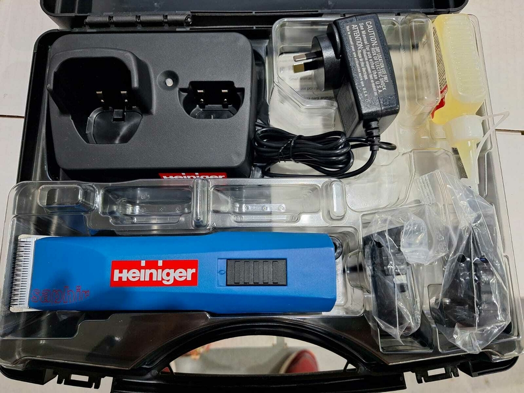 La peladora Heiniger Saphir con 2 baterías de iones de litio es una herramienta extremadamente poderosa, pero a la vez muy ligera y silenciosa, diseñada para el pelado de pequeños animales y el corte parcial de ganado y caballos. Su velocidad de 2650 golpes dobles por minuto garantiza un corte eficiente y preciso.